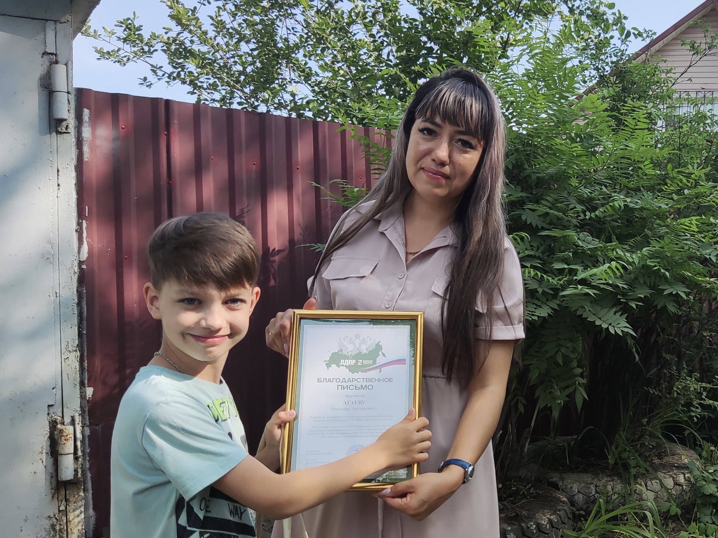 За доброту, отвагу и взаимопомощь представители благотворительного фонда «Время своих» и ЛДПР в Кузбассе вручили благодарственное письмо Ярославу Агаеву